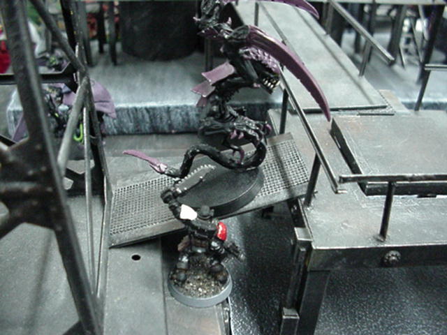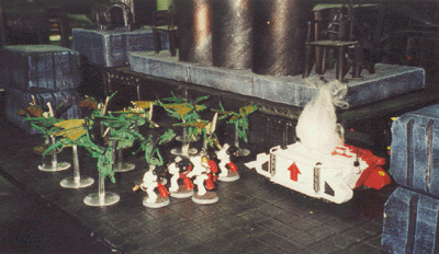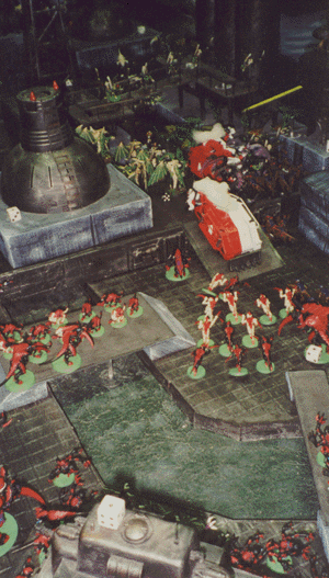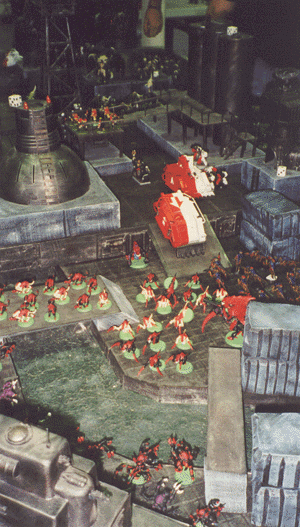 Roster for DAKKA DAKKA Mega-Battle of 1 December 2001.Roster Notes: Following our success in the Rogue Trader tournament, the Mega Battle found us using a similar roster, but with some slight adjustments. We kept the two devastater squads, and replaced the regular bolter dude with and additional heavy bolter. We made a couple of other adjustments; the Captain took a master crafted storm bolter, Brother Maldus, our excellent spiritual leader swapped his plasma pistol for a melta bomb, we pulled the rhino from one tac squad and instead gave it to the Captains command squad. We added a melta gun to that command squad as well. Just like in the previous battle we detached the techmarine and apothecary, we put the techmarine in the tac squad less the rhino, and the apothecary stuck it out with the short range devastator squad. We were completely unwarware of what the mission would entail, and here's what happened. The Storm Lords, along with a unit of Blood Angels, were charged with the initial assault on the underhive of the city, the battle's ultimate objective. In order for the Imperium to win, Imperial forces needed to occupy more buildings than the enemy. Reinforcements from the city above would arrive as soon as they could fight their way off of their own table, so there was no telling when they might arrive. Facing the Storm Lords and the Blood Angels were three different broods of Tyranids, significantly outnumbering the emperor's vanguard. As an added bonus to the Space Marines, all units arrived via deep strike, not an easy task when there are over 300 tyrnanid models on the table! This battle used CITYFIGHT rules as well, so it became very interesting.