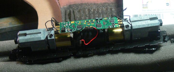 This conversion uses a Train Control Systems A4X drop in decoder in a Atlas RS-11 (Central Vermont 3611)