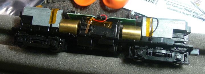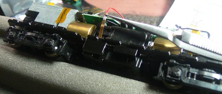 For a trial run, I just hooked up the truck leads and motor leads. A quick turn on the programming track set the decoder address, and another one on the main line checked that it was valid and the machine would respond. So far, so good!