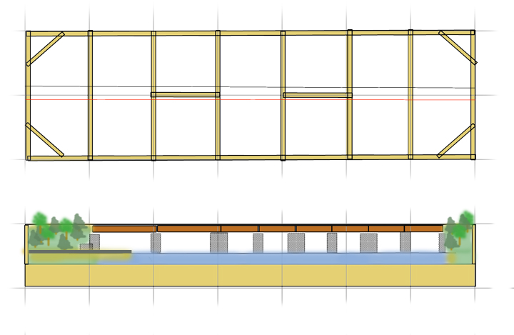 Piers and abutments are planned as solid wood construction, with a plaster (concrete) coating.